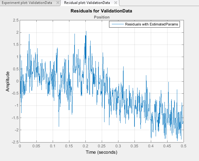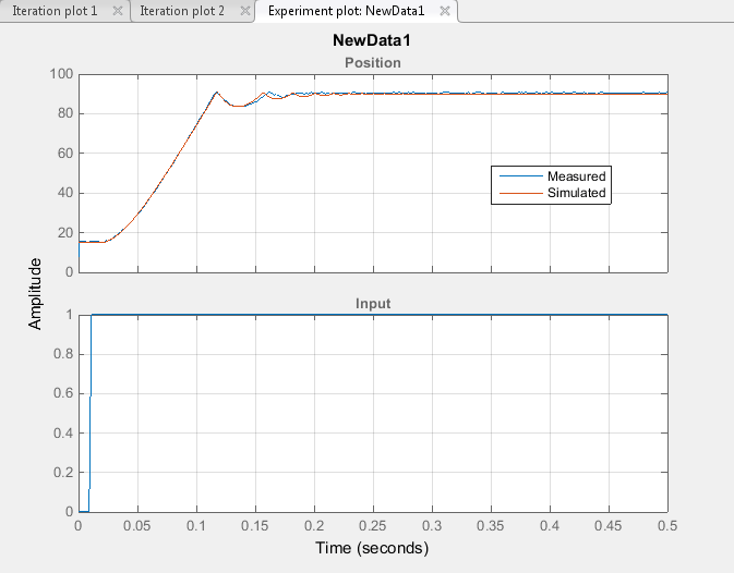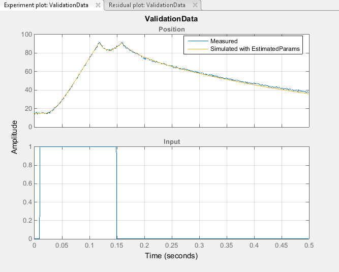 Создайте новый эксперимент для проверки. Назовите его ValidationData. Импорт проверочных данных ввода-вывода, input2 и position2и вектор времени, time2 в ValidationData эксперимент. Для этого в окне «Оценка параметров» на панели «Эксперименты» щелкните правой кнопкой мыши ValidationData и выберите Изменить... чтобы открыть редактор экспериментов. Затем введите [time2,position2] в диалоговом окне вывода и [time2,input2] в диалоговом окне ввода. Дополнительные сведения см. в разделе Импорт данных для оценки параметров.