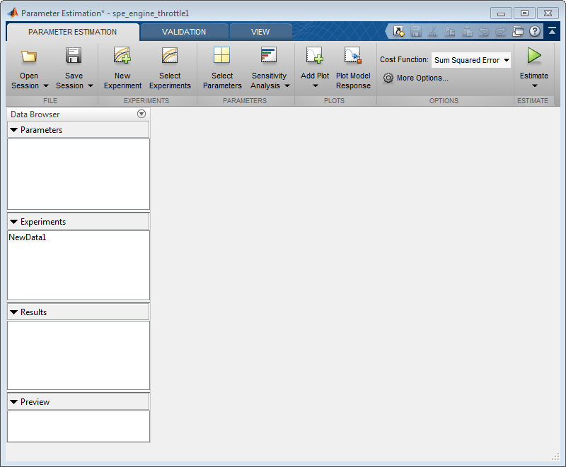 Это действие открывает новый сеанс с именем Оценка параметров (Parameter Estimation) - spe_engine_throttle1 в окне Оценка параметров (Parameter Estimator).