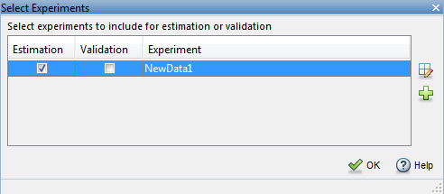 Укажите эксперимент для оценки. На вкладке Оценка параметров (Parameter Estimation) щелкните Выбрать эксперименты (Select Experiments) и установите флажок в столбце Оценка (Estimation). Нажмите кнопку ОК.