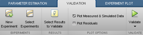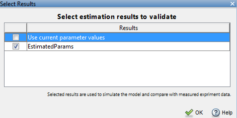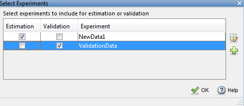 Выберите эксперимент для проверки. На вкладке Оценка параметров (Parameter Estimation) щелкните Выбрать эксперименты (Select Experiments). По умолчанию ValidationData Для оценки выбирают эксперимент. Снимите флажок, соответствующий ValidationData для оценки и установите флажок для проверки.