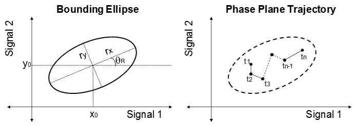 Плоскость X-Y - это фазовая плоскость, определяемая двумя сигналами. rx и ry являются радиусами ограничивающего эллипса по осям x и y, а startR - поворот эллипса вокруг центра. Центр эллипса находится в точке (x0, y0). На изображении траектория фазовой плоскости сигналов лежит в пределах ограничивающего эллипса для всех временных точек t1-tn.