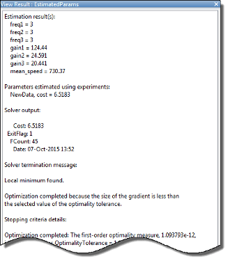 Чтобы просмотреть содержимое переменной, щелкните правой кнопкой мыши EstimatedParams и выберите Открыть... из меню. EstimatedParams включает в себя значения параметров, значение функции затрат и информацию о критериях остановки для оценки.