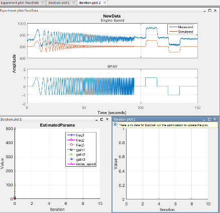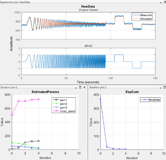 График зависимости измеренных и смоделированных данных показывает, насколько близко смоделированные данные соответствуют измеренным данным оценки. Графики графика расчетных параметров и функции затрат показывают изменения расчетного значения параметров и функции расчетных затрат для каждой итерации.