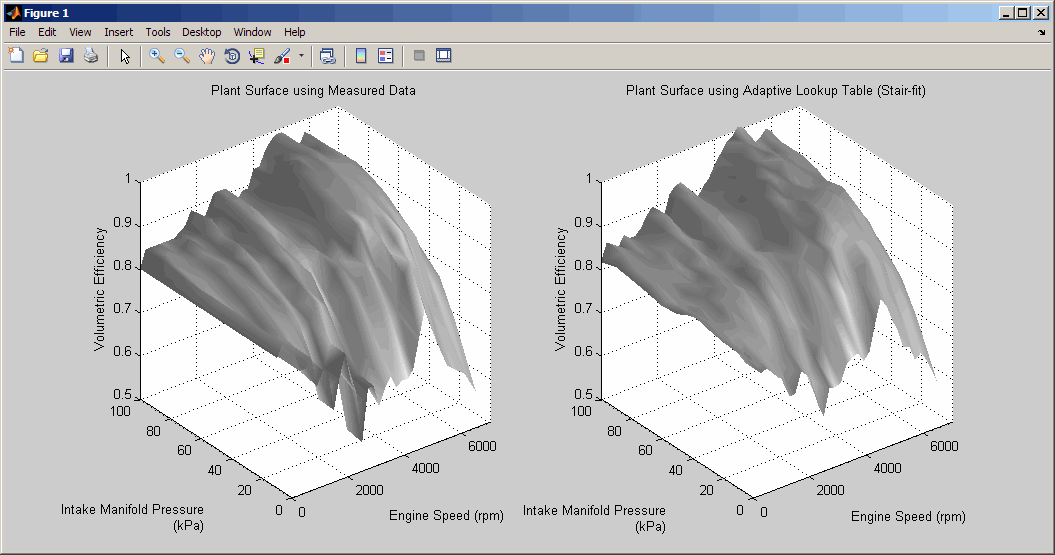 Во время моделирования значения таблицы поиска, отображаемые на правом графике, адаптируются к изменениям данных ввода-вывода. Левый и правый графики напоминают друг друга через несколько секунд, как показано на следующем рисунке.