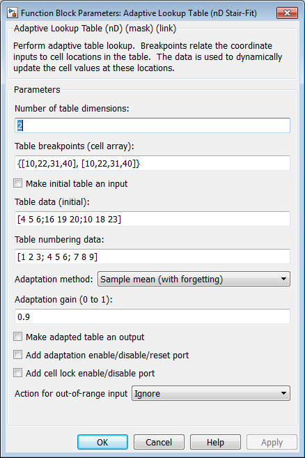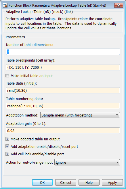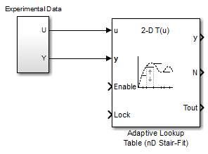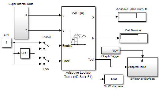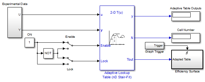 Во время моделирования блок «Таблица адаптивного поиска» работает как статическая таблица поиска и продолжает оценивать выходные значения при изменении входных значений. Текущее значение таблицы подстановки можно увидеть в Adaptive Table Outputs блок в окне модели Simulink.