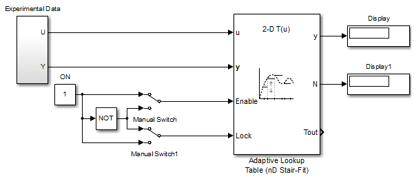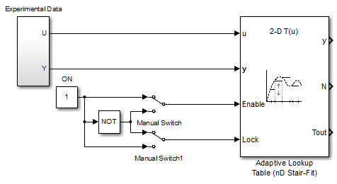 Дважды щелкните значок Lock блок. Это действие переключает коммутатор и подает выходной сигнал ON блок кLock входной порт Adaptive Lookup Table(nD Stair-Fit) блок.