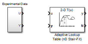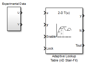 Назначьте входные и выходные данные модели двигателя, подключив U и Y порты блока экспериментальных данных u и y порты блока «Таблица адаптивного поиска» соответственно.