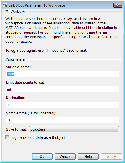 Дважды щелкните блок «В рабочее пространство», чтобы открыть диалоговое окно «Параметры блока раковины», и введите Tout в поле Имя переменной.