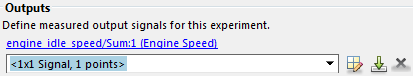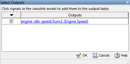 Можно добавить блок Вывод (Output) в редакторе экспериментов, щелкнув Выбрать измеренные выходные сигналы (Select Measured Output Signals) на панели Выходы (Outputs), чтобы открыть диалоговое окно Выбор выходных сигналов (Select Outputs). Можно выбрать требуемый блок исходящего порта, установив соответствующий флажок и нажав кнопку OK. Существует только один блок исходящего порта для engine_idle_speed модель.