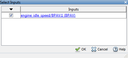 Можно добавить блок Inport в редакторе экспериментов, нажав кнопку Select Inputs на панели Inputs, чтобы открыть диалоговое окно Select Inputs. Можно выбрать требуемый блок ввода, установив соответствующий ему флажок и нажав кнопку OK. Существует только один блок ввода для engine_idle_speed модель.