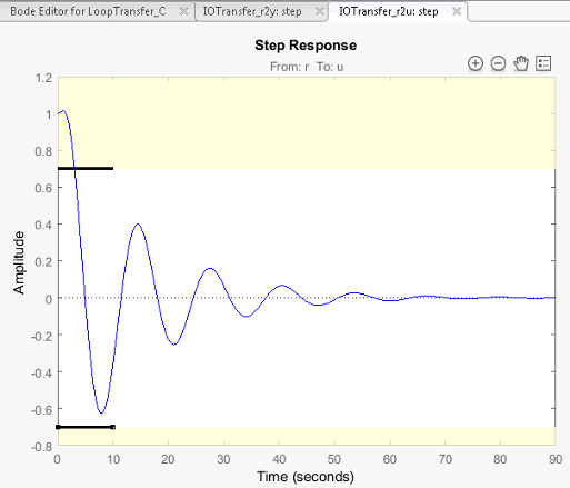 Нажмите кнопку OK. График ответа второго шага для ответа с замкнутым контуром из r кому u формируется в приложении. График содержит горизонтальную линию, представляющую верхний предел сигнала исполнительного механизма.