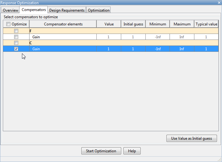 На вкладке Компенсаторы установите флажки в столбце Оптимизировать, соответствующие настраиваемым элементам компенсатора.