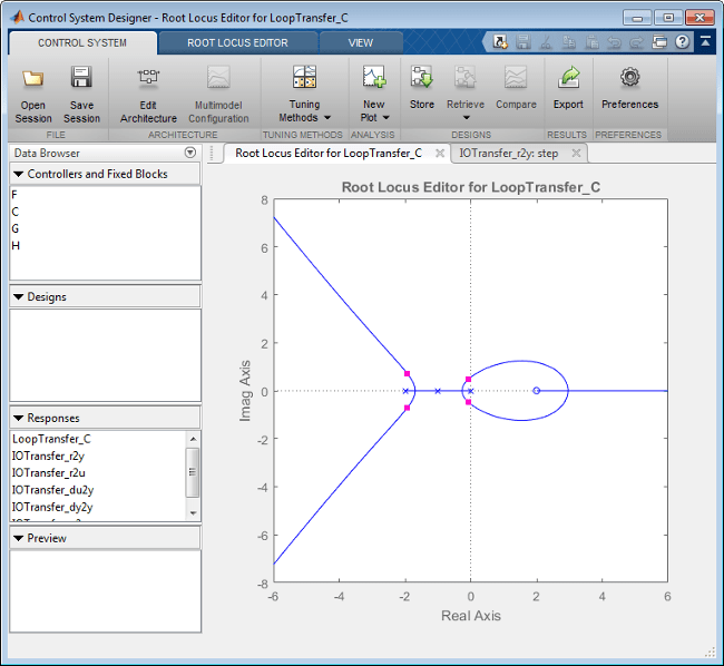 Откроется приложение Control System Designer и откроется редактор корневых локусов. Приложение позволяет создавать контроллеры для систем с одним входом и одним выходом (SISO) в MATLAB ® и Simulink. Дополнительные сведения см. в разделе Классическое проектирование системы управления (панель инструментов системы управления).