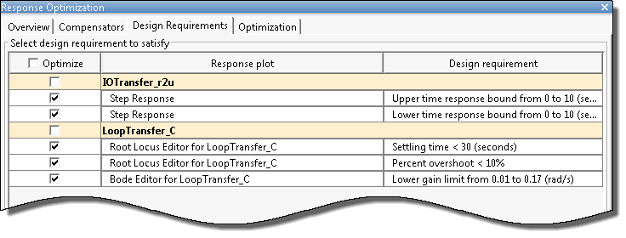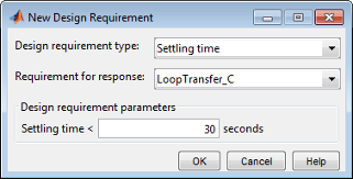 При использовании с программным обеспечением Control System Toolbox™ можно задать требования к проектированию Simulink ® Design Optimization™ или ограничения для графиков в приложении Control System Designer (Control System Toolbox). Можно включить требования к проектированию для оптимизации отклика в частотной и временной областях.