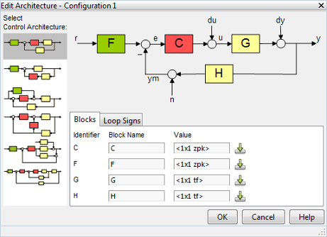 Чтобы выбрать архитектуру проектируемой системы управления, в приложении щелкните Изменить архитектуру. В этом примере используется архитектура по умолчанию. В этой системе модель завода G является функцией переноса с разомкнутым контуром. open_loopTF. Предварительный фильтр, F, и датчик, H, установлены в 1и компенсатор, C, является компенсатором, который разработан с использованием методов оптимизации отклика.