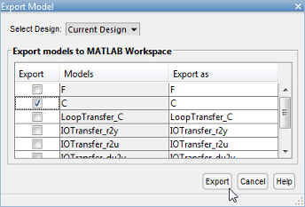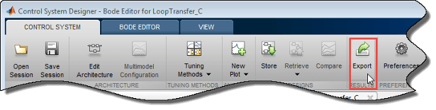После проектирования компенсатора его можно экспортировать в рабочую область MATLAB и создать модель полной системы замкнутого цикла. Для экспорта настроенного компенсатора: