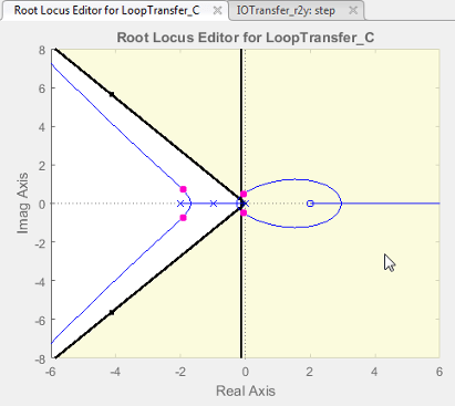 В приложении требование к дизайну отображается на графике корневого локуса как две линии, излучаемые под углом от начала координат.