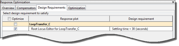 После добавления требований к конструкции можно выбрать подмножество требований к конструкции контроллера, как описано в разделе Выбор требований к конструкции для использования при оптимизации отклика. На вкладке Требования к конструкции (Design requirements) окна Оптимизация отклика (Response Optimization) можно создать требования к конструкции и выбрать требования, которые необходимо использовать для оптимизации.