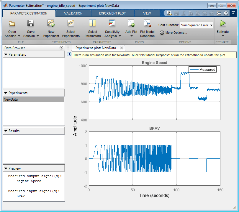 Это создает графики входного сигнала для блока Inport BPAV и выходной сигнал для блока Outport Engine Speed для engine_idle_speed модель (см. раздел Создание эксперимента).