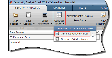 В анализаторе чувствительности после выбора параметров в наборе параметров щелкните Генерировать значения (Generate Values) и выберите Генерировать случайные значения (Generate Random Values).