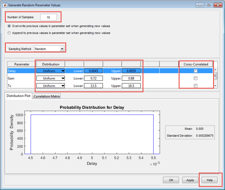 После формирования значений параметров постройте их график, чтобы проверить, соответствуют ли сгенерированные значения параметров заданным спецификациям. Это важно, если для каждого набора параметров создается небольшое количество случайных выборок. Дополнительные сведения см. в разделе Проверка сгенерированного набора параметров.