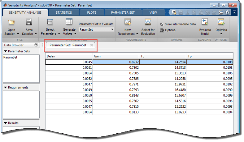 Выборки параметров создаются путем изменения значения параметров модели Simulink и состояний, представляющих интерес, в соответствии с заданным распределением вероятностей. Эти параметры и состояния в совокупности называются параметрами. Каждая комбинация сгенерированных значений параметров называется точкой выборки или точкой выборки. Совокупность образцов называется пространством проектирования, пространством образца или набором параметров.