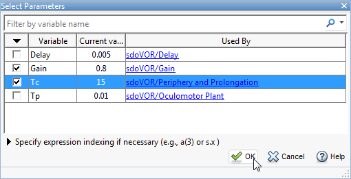 В анализаторе чувствительности на вкладке Анализ чувствительности (Sensitivity Analysis) щелкните Выбрать параметры (Select Parameters).