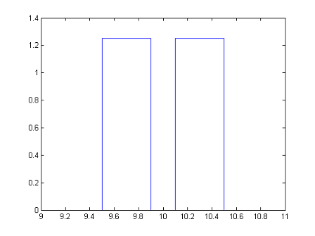 x = [0.95 0.99 1.01 1.05]*R.Value; F = [0 0.5 0.5 1]; pdR = makedist('PiecewiseLinear','x',x,'Fx',F); x = linspace(0.9*R.Value,1.1*R.Value,1e3); plot(x,pdf(pdR,x));
