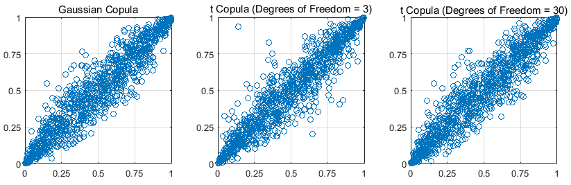 Можно использовать гауссову копулу (по умолчанию) или t копулу. Используйте t копул, когда вероятность экстремальных значений параметров не пренебрежимо мала (распределение тяжелохвостое), и укажите степени свободы. При увеличении степеней свободы t-копула сходится к гауссовой копуле, и вероятность экстремальных значений параметров становится ничтожной. На следующем рисунке показано 1000 образцов, взятых для двух параметров в интервале от 0 до 1 с использованием гауссовой и t-копул.