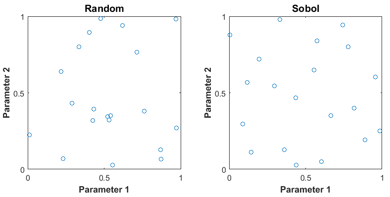На рисунке показаны 20 образцов для двух параметров. Выборки генерируются из однородного распределения в интервале от 0 до 1. Случайная выборка может привести к большим промежуткам между некоторыми выборками и близкой кластеризации других выборок. Методы квазирандомной выборки Соболя и Халтона позволяют избежать пробелов и кластеризации образцов. Если в наборе параметров много параметров, наборы Соболя дают более систематическое заполнение пространства, чем наборы квазирандом Халтона. Дополнительные сведения см. в разделе Создание квазислучайных чисел (панель инструментов для статистики и машинного обучения).
