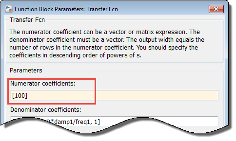 На этом рисунке параметр числительных коэффициентов блока Transfer Fcn задается как числовое значение.