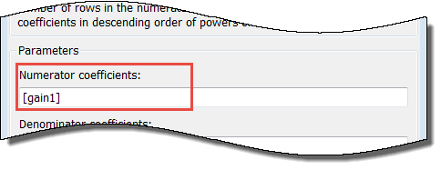 Чтобы оценить параметр Числитель коэффициентов, укажите его как переменную gain1:
