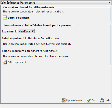 Чтобы выбрать параметры для оценки в конкретном эксперименте, сначала выберите эксперимент для оценки, как описано в разделе Параметры и состояния оценки. Затем можно использовать диалоговое окно Edit: Estimated Parameters для выбора параметров для этого эксперимента. Выберите имя эксперимента из выпадающего списка «Эксперимент:» на панели «Параметры и начальные состояния, настроенные на эксперимент». Затем щелкните Изменить эксперимент, чтобы запустить редактор эксперимента для выбранного эксперимента.