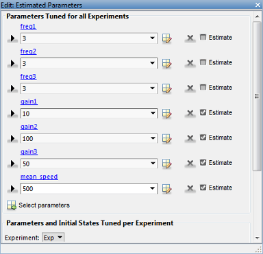 Например, в engine_idle_speed модель, выберите freq1, freq2, freq3, gain1, gain2, gain3 и mean_speed для оценки. Не нужно оценивать параметры сразу. Сначала можно выбрать все интересующие параметры, а затем выбрать подмножество для оценки. По умолчанию для оценки выбираются все параметры. Чтобы отменить выбор тех, которые не требуется оценивать, снимите флажок Оценка (Estimate) для параметра. Для этого примера следует только оценить gain1, gain2, gain3 и mean_speed. Задайте их начальные значения 10, 100, 50 и 500 соответственно, а затем нажмите кнопку OK. Диалоговое окно Edit: Estimated Parameters выглядит следующим образом.