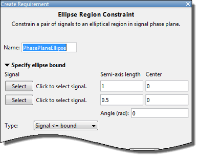 Можно наложить эллиптическую границу на траекторию фазовой плоскости двух сигналов в модели Simulink. Траектория фазовой плоскости представляет собой график двух сигналов друг против друга. Задаются радиусы, центр и поворот ограничивающего эллипса. Также можно указать, должна ли траектория двух сигналов лежать внутри или снаружи эллипса.