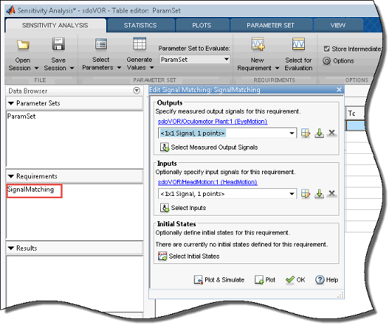 Можно указать требование согласования сигналов для сопоставления выходов модели с измеряемыми сигналами. Это требование также известно как эксперимент в методе оценки параметров. Чтобы указать требование согласования сигнала, выполните следующие действия.