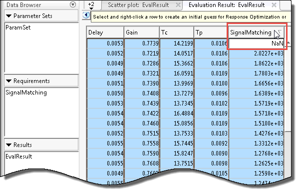 После создания набора параметров можно определить функцию затрат путем создания требований к конструкции для сигналов модели. Затем вычисляется функция затрат для каждого набора значений параметров. Для проверки результатов анализа проверьте значения функции оцененных затрат. Если аналитические отчеты функции затрат содержат NaN значения, которые могут указывать на проблему.
