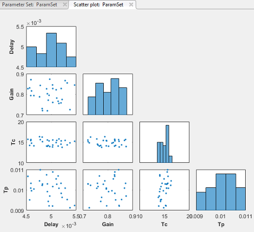 Проверьте гистограммы, чтобы убедиться, что сгенерированные значения параметров соответствуют заданным распределениям параметров. Проверьте графики рассеяния вне диагонали, чтобы убедиться в наличии любых заданных корреляций между параметрами.