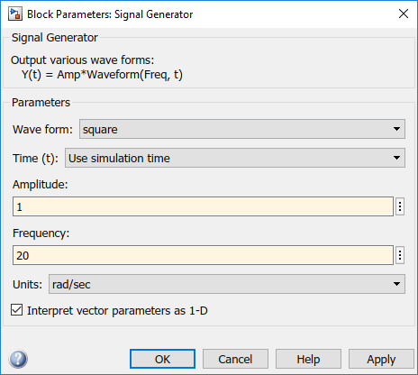 Дважды щелкните на блоке «Генератор сигналов». В списке Форма волны выберите square.
