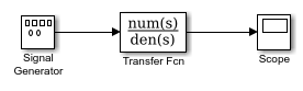 Выберите Simulink > Continuous, а затем добавьте в модель блок Transfer Fcn.