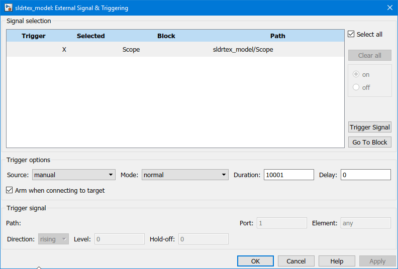 Данные сохраняются в рабочей области MATLAB ® через блок Simulink ® Scope. Установите свойства signal и triggering только при запуске приложения реального времени. При выполнении моделирования в обычном режиме или в режиме ускорителя эту процедуру можно пропустить.