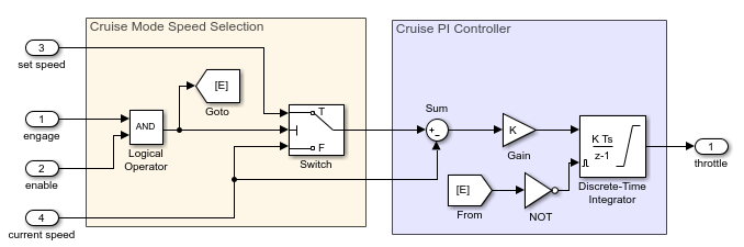 Когда система активирована, блок Switch проходит set speed к контроллеру PI. Контроллер PI вычисляет throttle интегрированием члена ошибки, определяемого разницей set speed - current speed.