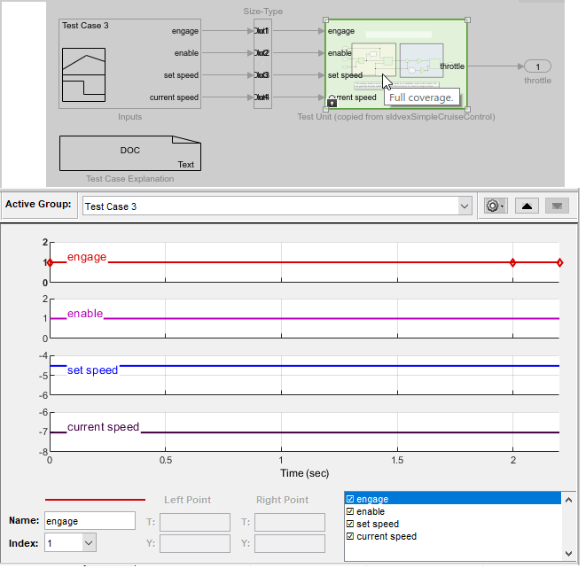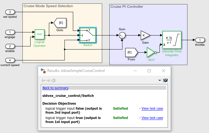 В этом учебном пособии описывается упрощенная модель круиз-контроля, которая управляет скоростью дроссельной заслонки. Создаются тестовые примеры, удовлетворяющие требованиям условий и модели принятия решений, а затем моделируются эти тестовые примеры для создания отчета о покрытии модели.