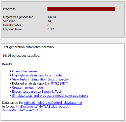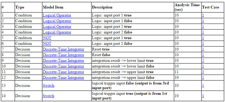 Результаты анализа дают подробное описание целей покрытия для каждого элемента модели и генерируют тестовые примеры для всех удовлетворенных целей. Для измерения покрытия модели моделируются созданные контрольные примеры.