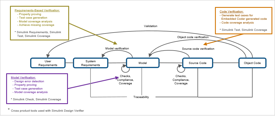 Эта схема рабочего процесса демонстрирует возможности Simulink Design Verifier на различных этапах процесса проверки и проверки. Дополнительные сведения см. в разделе Проверка и проверка.