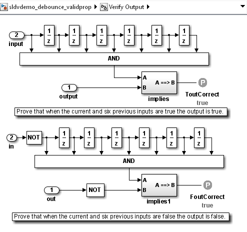 sldvdemo_debounce_validprop пример модели включает в себя подсистему проверки, называемую верификацией выходных данных, как показано на рисунке ниже.