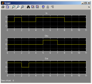 Obs не наблюдается в течение первого true продолжительность In, так Out становится false в течение одного временного шага. Obs наблюдается в течение второго true продолжительность In, так Out является true. Когда нет true продолжительность In, Out остается true.