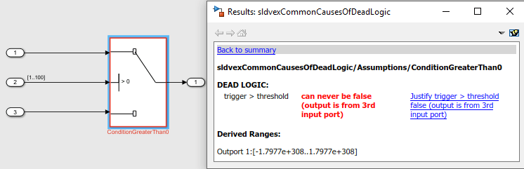 Блоки ввода корневого уровня с минимальными и максимальными значениями в качестве ограничений и блоки тестовых условий в тестовой генерации могут вызывать неработоспособность логики. Например, рассмотрим блок ConditionGreaterThan0 Switch, где второй блок Inport имеет минимальный и максимальный диапазоны 1 и 100 соответственно. Это приводит к тому, что блок коммутатора в этой подсистеме имеет неработоспособную логику.