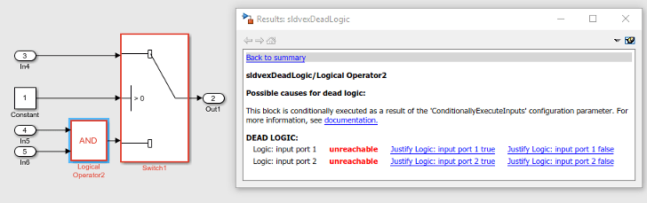 Если модель состоит из блоков Switch или Multiport Switch и параметр выполнения условной входной ветви имеет значение On, условное выполнение часто может вызвать неожиданную мертвую логику.