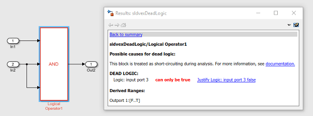 Simulink Design Verifier обрабатывает логические блоки так, как будто они имеют короткое замыкание при анализе неработающей логики.